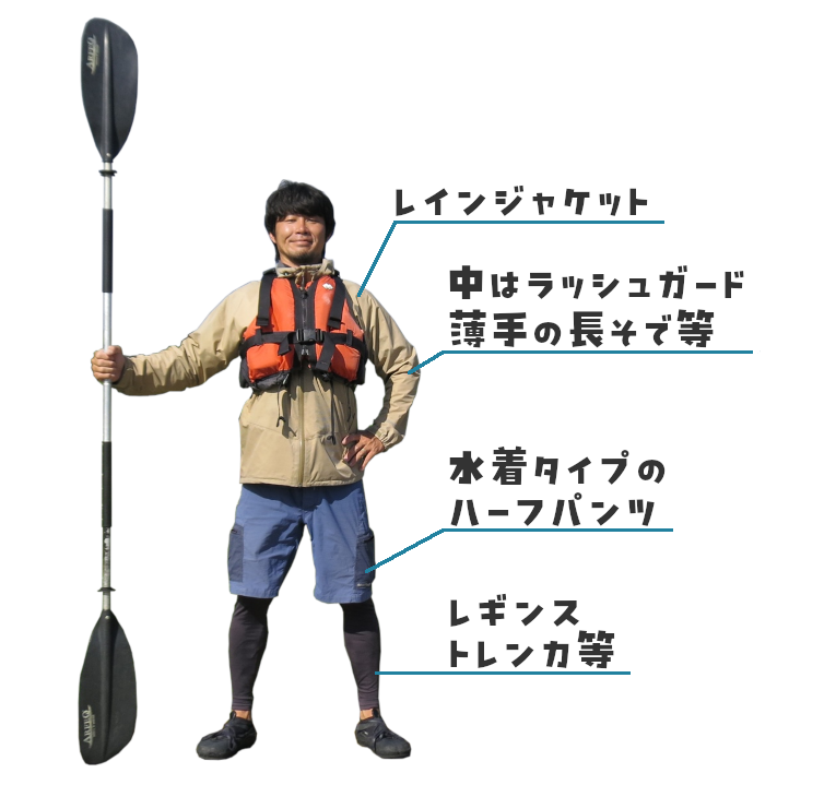 • 上半身:ラッシュガードやヒートテック+レインジャケット