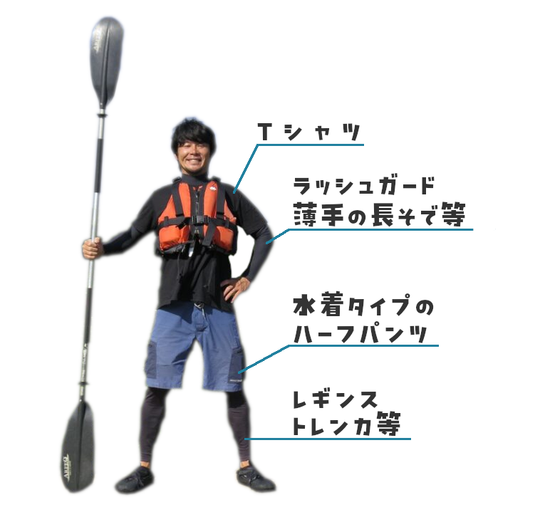 • 下半身:ハーフパンツ(水着タイプがお勧め)の下にレギンス・スパッツを着用ください。